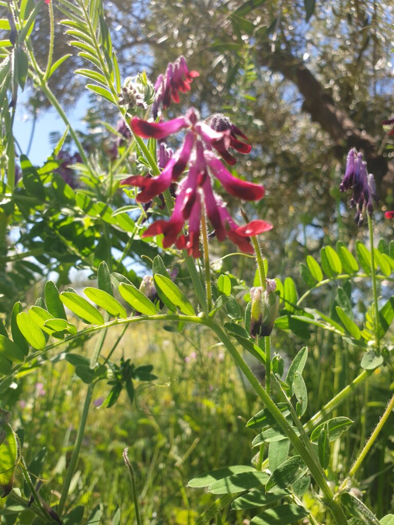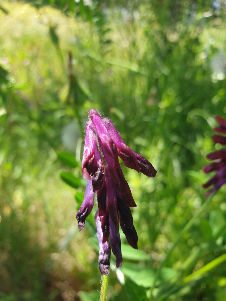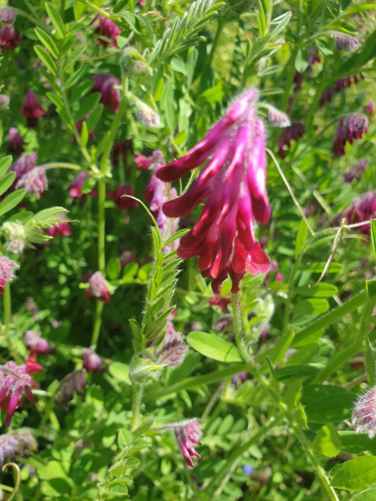 Cette magnifique vesce peut se reconnaître assez facilement à la couleur pourpre foncé de ses fleurs. Ses feuilles et ses tiges sont couvertes d’une longue pilosité soyeuse. C’est une plante des champs secs et des pelouses.