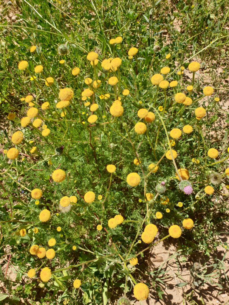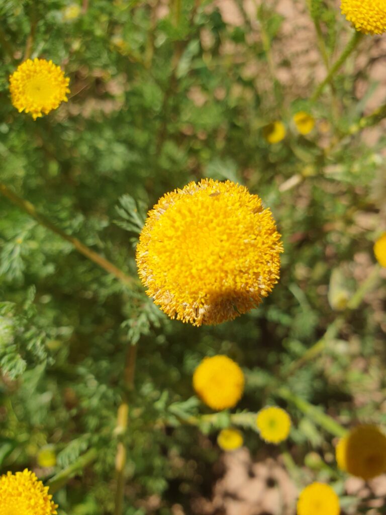 La Santoline petit-cyprès ( Santolina chamaecyparissus ) aussi appelée camomille de Mahon. est un sous-arbrisseau méditerranéen persistant, apprécié pour son feuillage argenté, duveteux et très aromatique, formant une boule compacte de 50 cm de haut. Elle se distingue par ses feuilles fines rappelant les écailles de cyprès et sa floraison estivale jaune d'or en pompons.