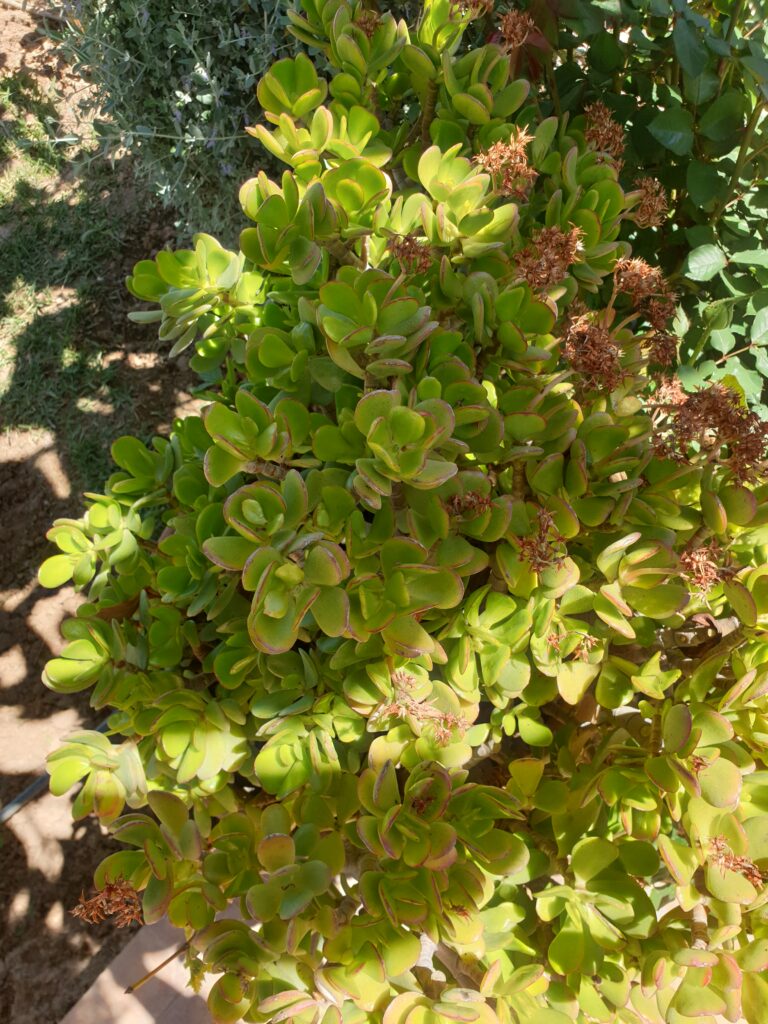 Crassula ovata est un arbuste sempervirent, très branchu et complètement glabre, pouvant atteindre 3 mètres de haut. Il ne doit pas être confondue avec Crassula arborescens, moins répandue mais très ressemblant. Les tiges peuvent atteindre jusqu’à 20 cm à la base.